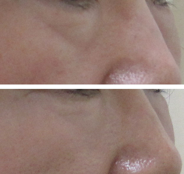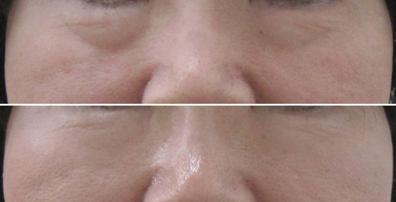 施術前/1か月後・・・グロースファクターのみで目の下のふくらみが目立たなくなっています。