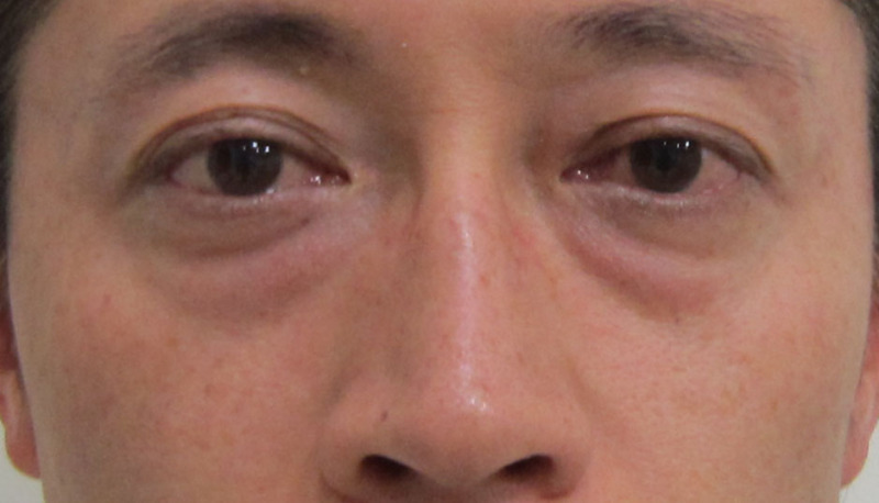術前・・・目の下にふくらみ+くぼみがあります。
