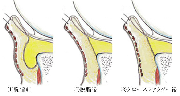 上の図は、左から、①脱脂前、②脱脂直後、③グロースファクター後の状態を示します。(玉川田島クリニックの画像を改変)