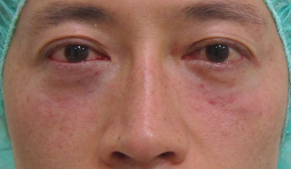 術前・・・目の下にふくらみ(目の下のたるみ:目の下の脂肪の量は中程度)とくぼみがあります。
