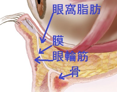 目の下の脂肪を包んでいる膜は眼窩隔膜(がんかかくまく)と言い、目の下の脂肪を包んでいる形になっています。