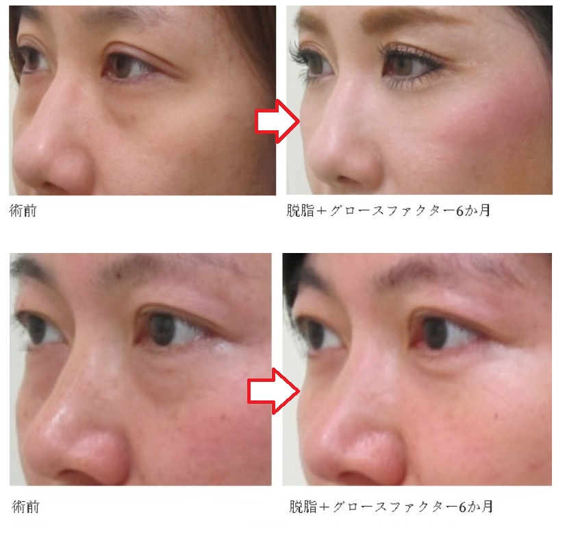 涙袋の立ち上がり部分の皮膚が薄くくぼんでいるところにグロースファクターによりハリを出させることで涙袋を比較的マイルドにすることができます。