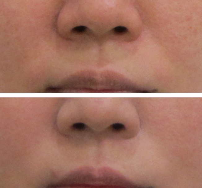 施術前/3カ月後・・・もともと深くはありませんが、特に左側(向かって右)の法令線が緩和されています。