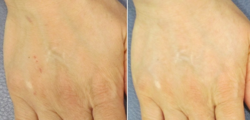 施術前/3カ月後・の比較・・皮膚のコラーゲンが増えることでハリが出て、血管の凹凸を隠すことができます。