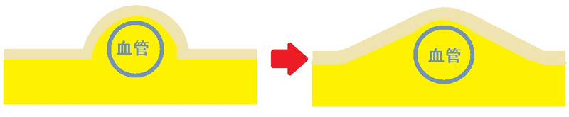 皮膚のハリがない場合、血管の形がそのまま出てしまいますが、皮膚がピンと張ると血管の形が目立ちにくくなります。