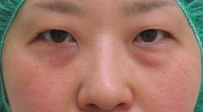 術前・・・目の下にふくらみ(脂肪)とくぼみ(皮膚のたるみ)があります。