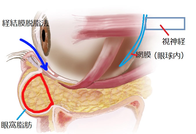 視力に関係する網膜や視神経は、経結膜脱脂法の手術操作をする場所から離れた場所にある