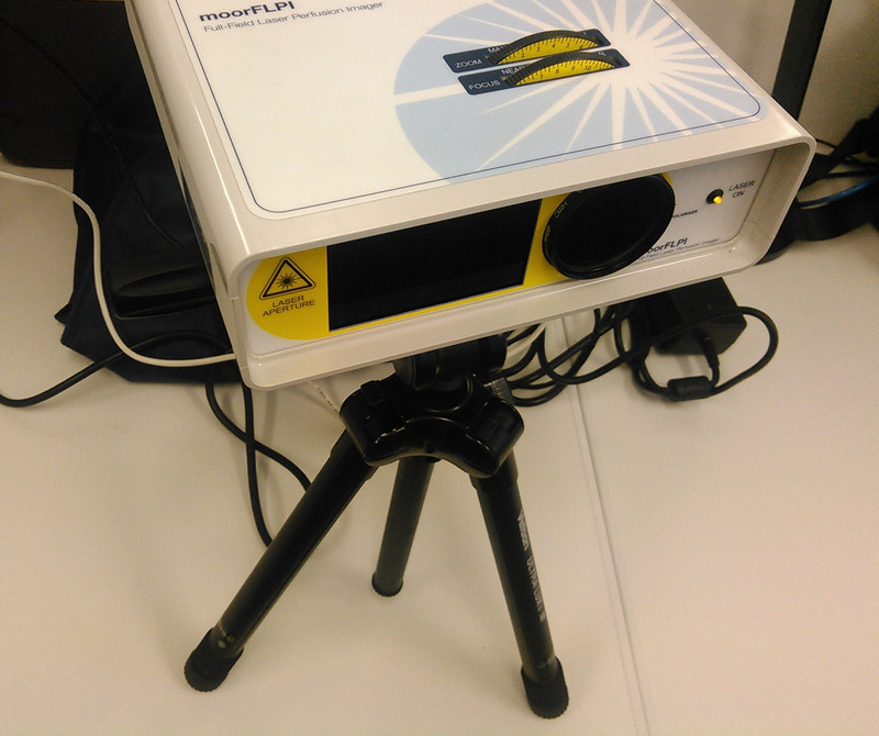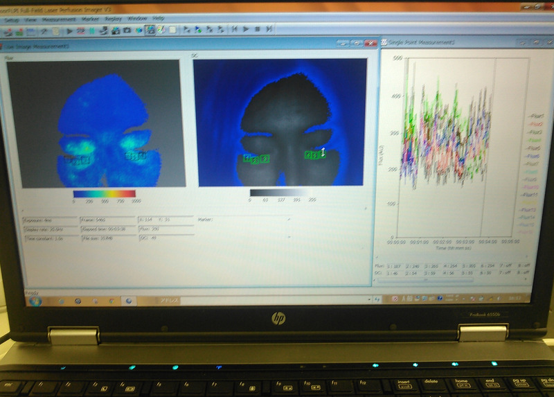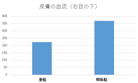 目の下の皮膚の血流を坐位(座った状態)と仰臥位(仰向けに寝た状態)で測定しました。