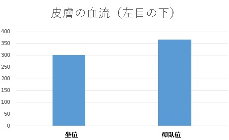 あくまでも1例のみの結果ですが、仰臥位、つまり上を見た状態で皮膚の血流が改善しています。