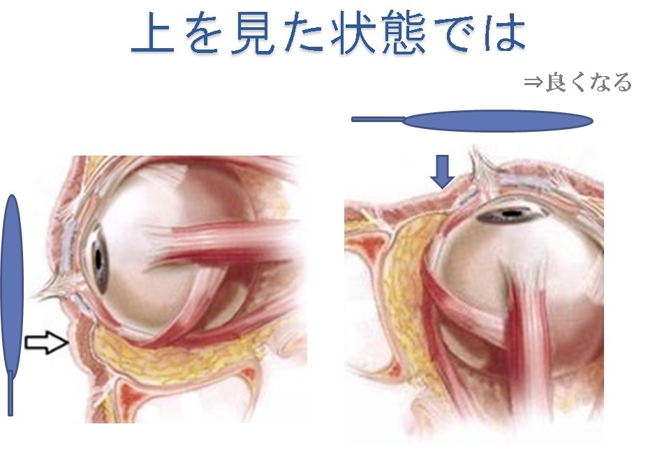 上を見た状態では、目の下の脂肪は少し後ろに移動して、突出が軽減されます。