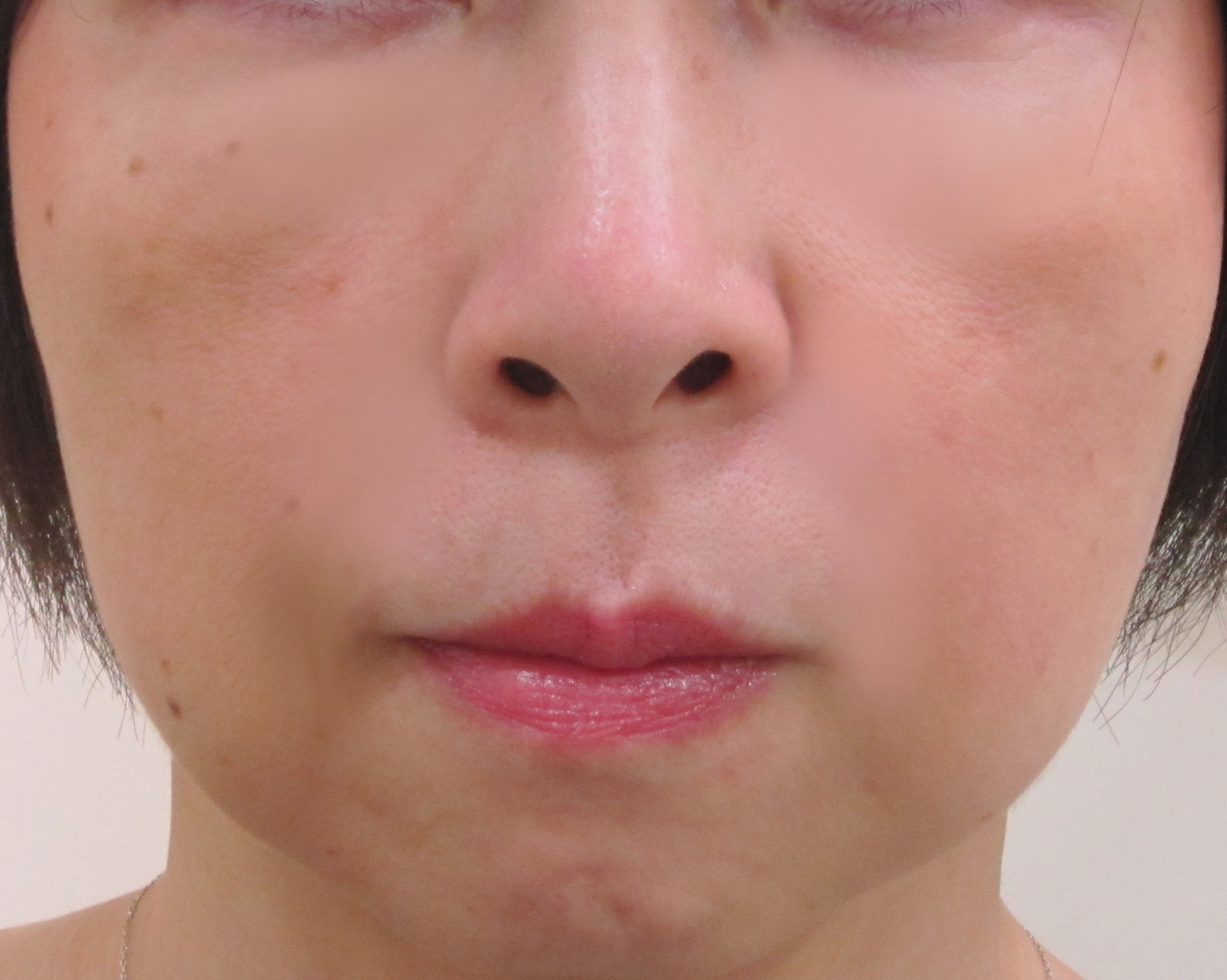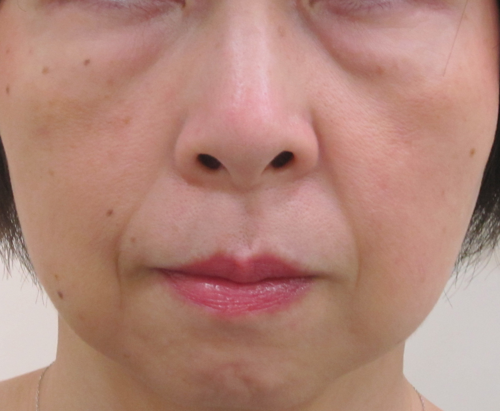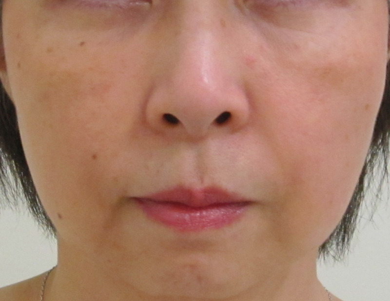 術後9ヶ月・・・細かいところで多少差はありますが、目の下・頬・ほうれい線の改善度合いはだいたいシミュレーション通りになっていると思います。