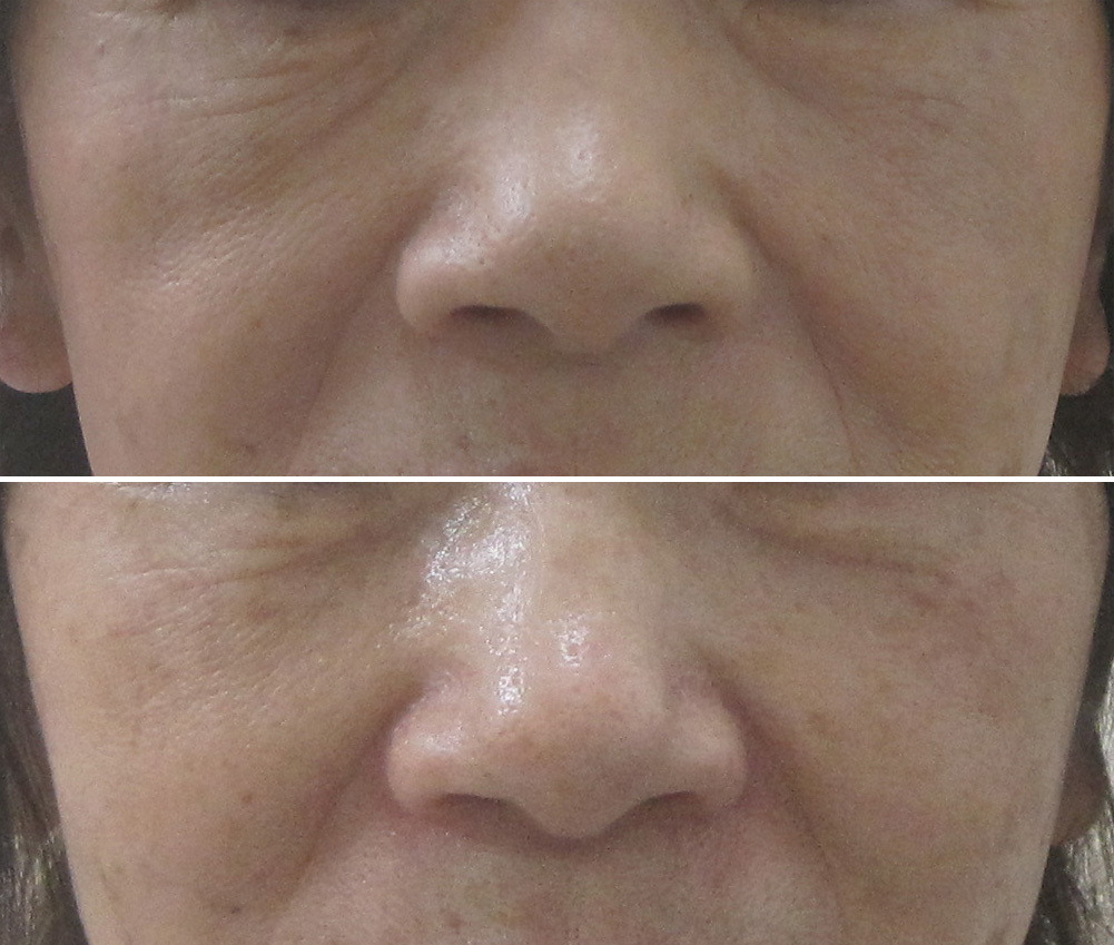 治療前(メイクあり)/4ヵ月後(メイクなし)・・・目尻の小ジワもきれいになっていますね。