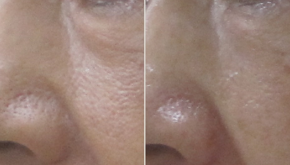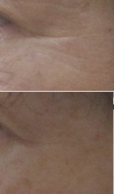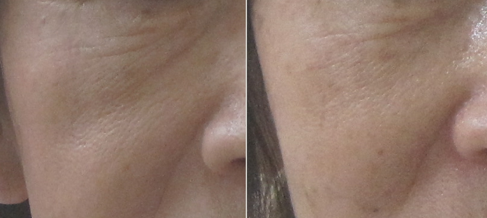 治療前(メイクあり)/4ヵ月後(メイクなし)・・・小ジワ・毛穴が改善しています。