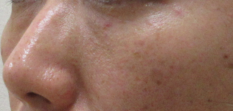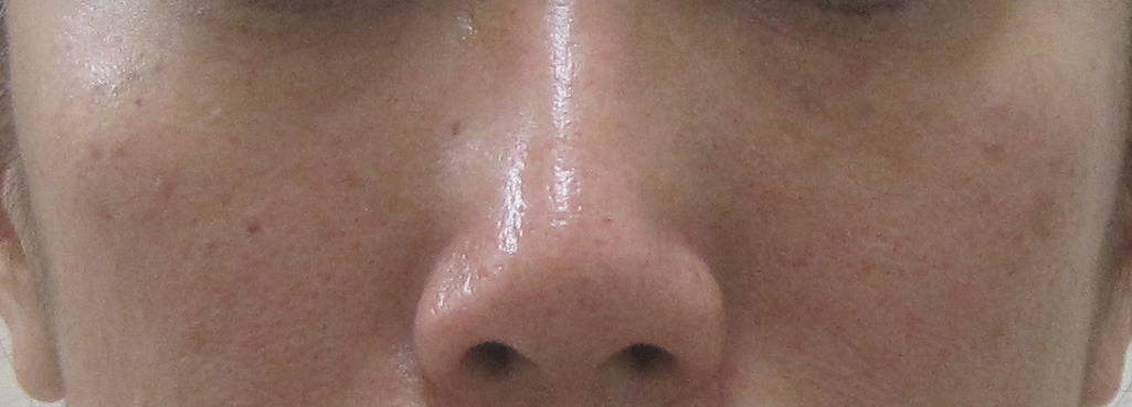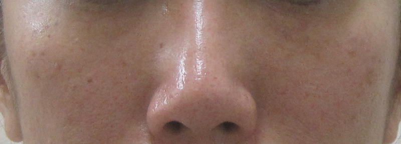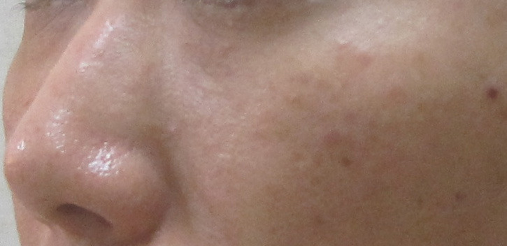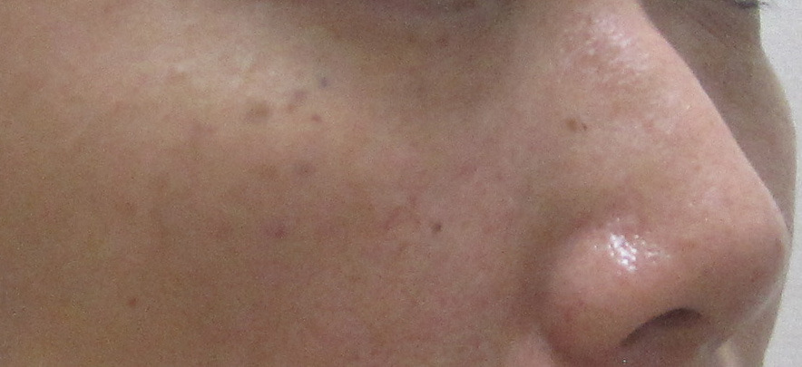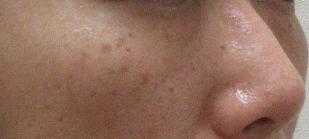 右頬に数箇所見られるシミはADMと呼ばれるもので、メラフェードでは治療できません。