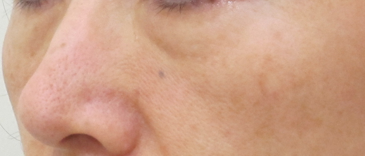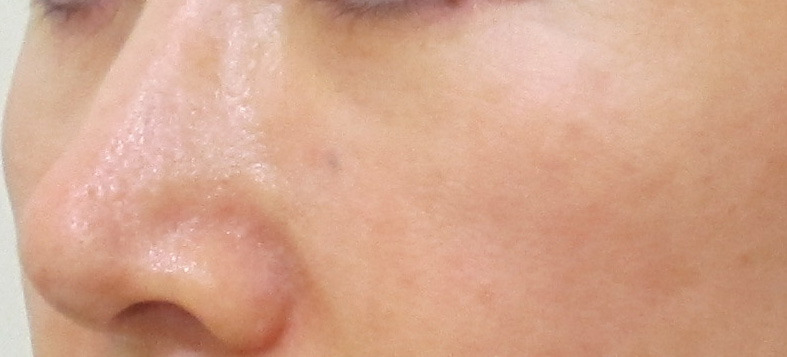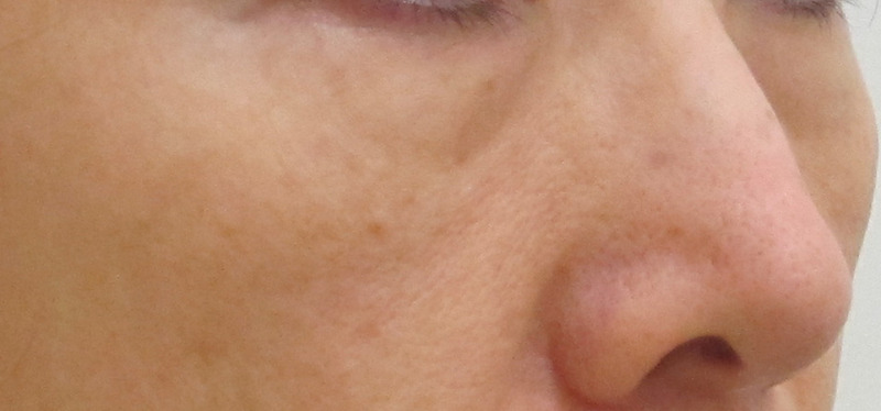 左頬のくぼみについて、「鏡を見た時にこけて見える」とおっしゃっていましたが、実際には、ほとんどくぼみはありません。(上述の通り、シミ・くすみが屋内でくぼみに見えていることが考えられます。)