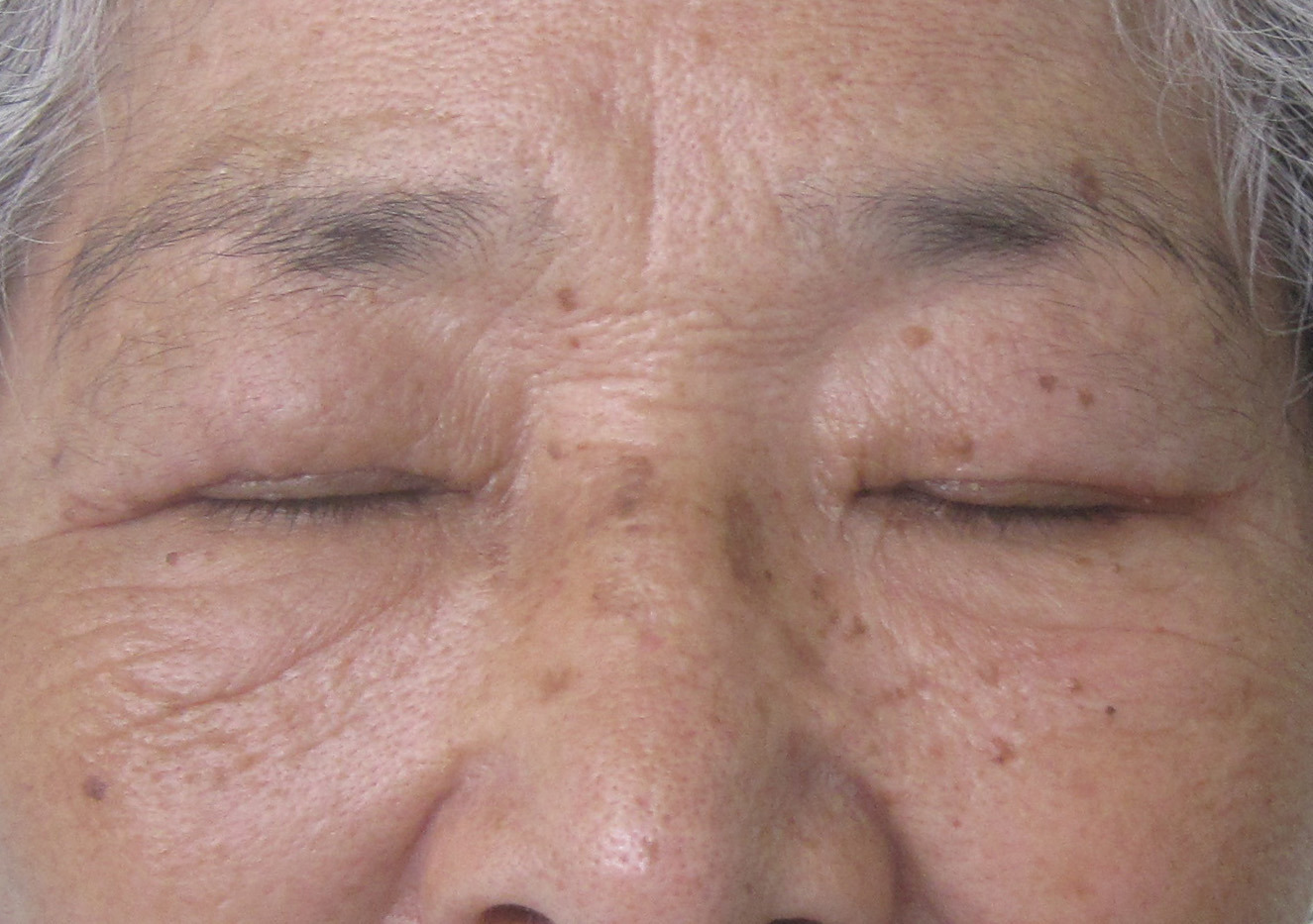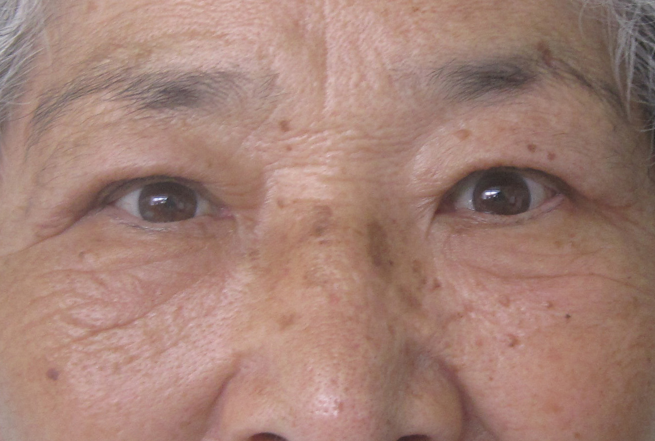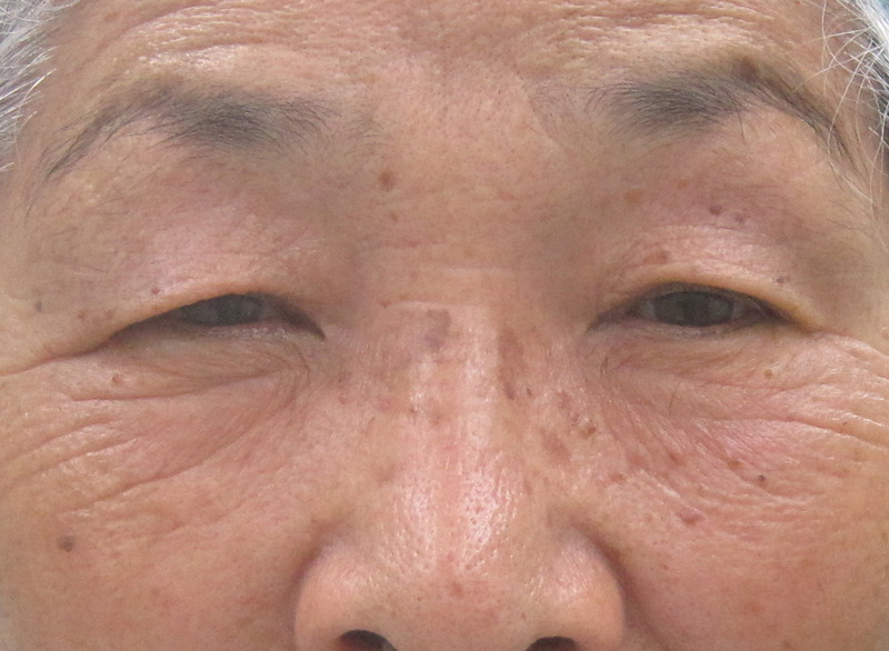 さらに、目を開けようとするあまり、眉毛を上げる癖が生じて、額にシワが寄ってしまっています。