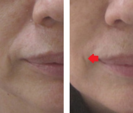 グロースファクターによる法令線治療前(頬・口角も施術)/1年2ヵ月後・・・矢印のところにシワが少し残っています。