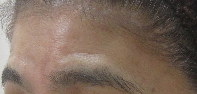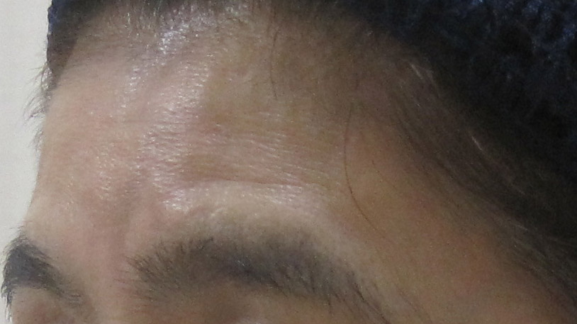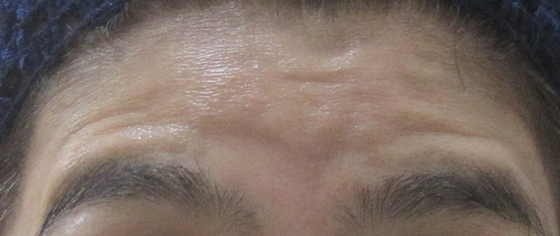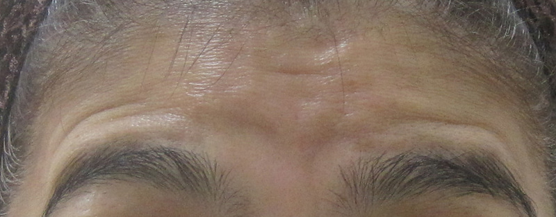 施術前・・・力いっぱい額にシワを寄せた状態です。