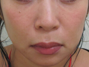 はっきりとしたマリオネットラインは見られませんが、口元のたるみおよびフェイスラインのたるみがわずかにあります。