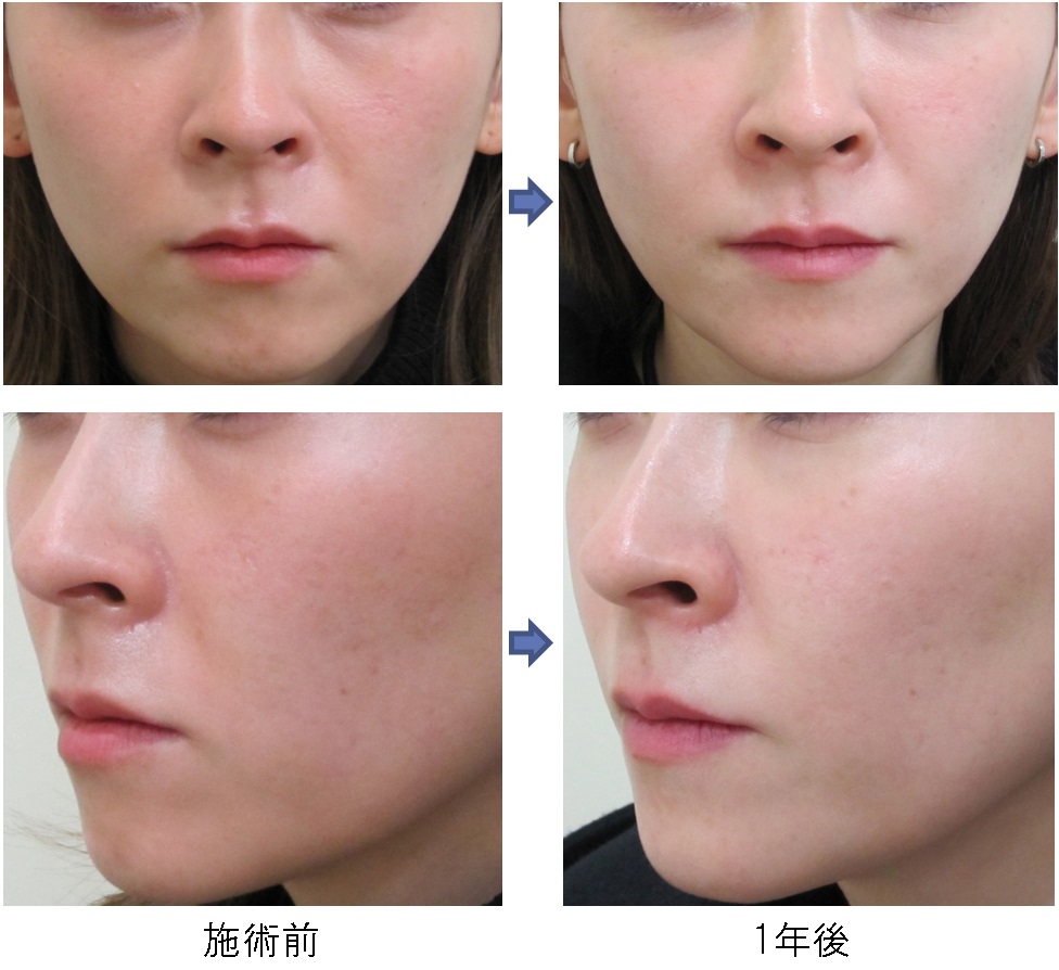 施術前/8か月後・・・3年前に他院様にて脱脂+ヒアルロン酸注入を受けられた方の修正治療例です。