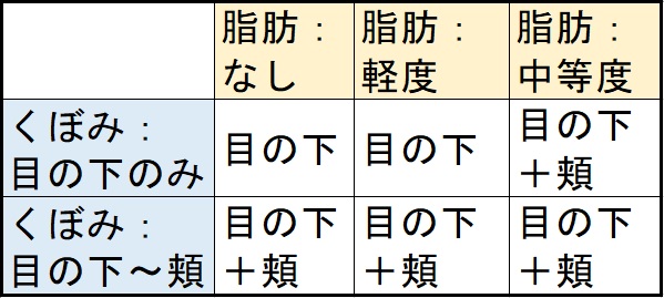②くぼみの範囲・・・目の下のみ、目の下~頬のどちらに該当するか