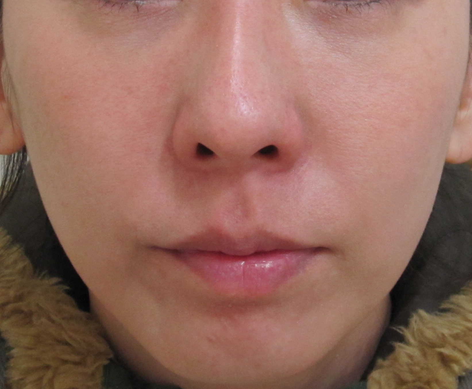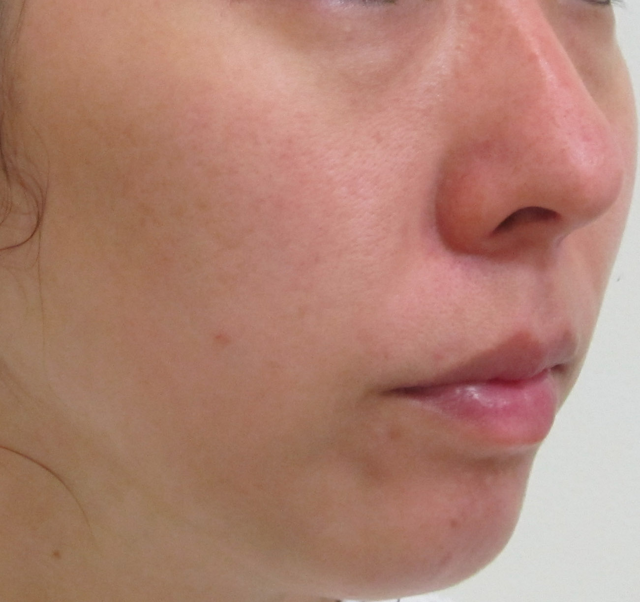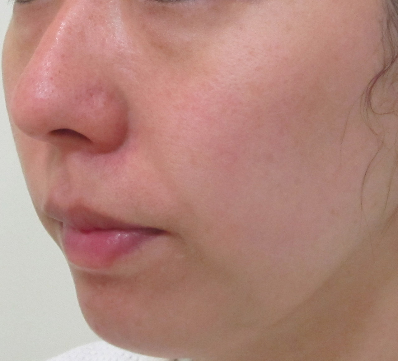 頬の脂肪の厚みにより、法令線の左右差(右<左)がみられます。