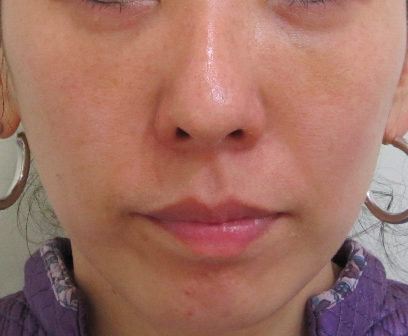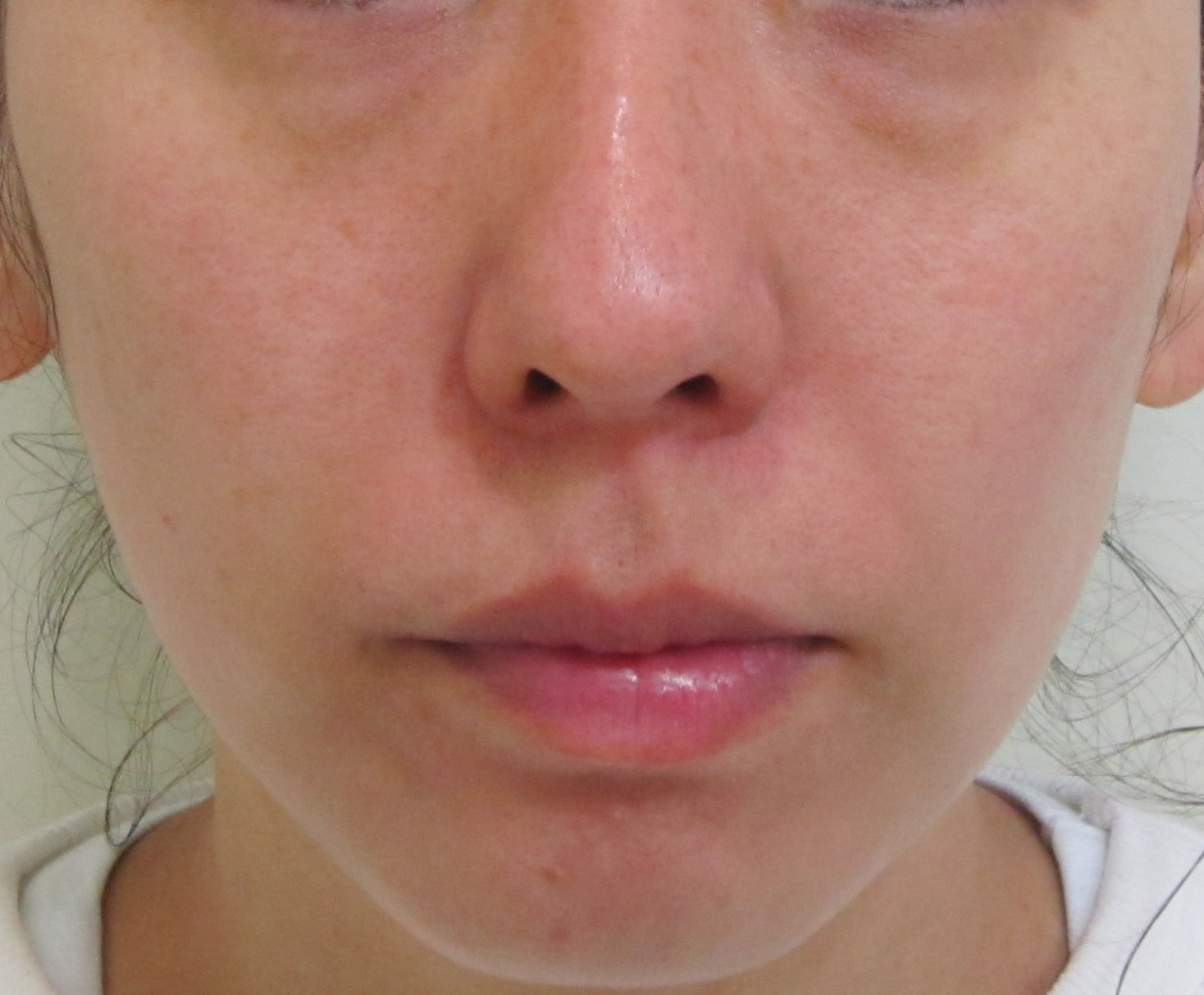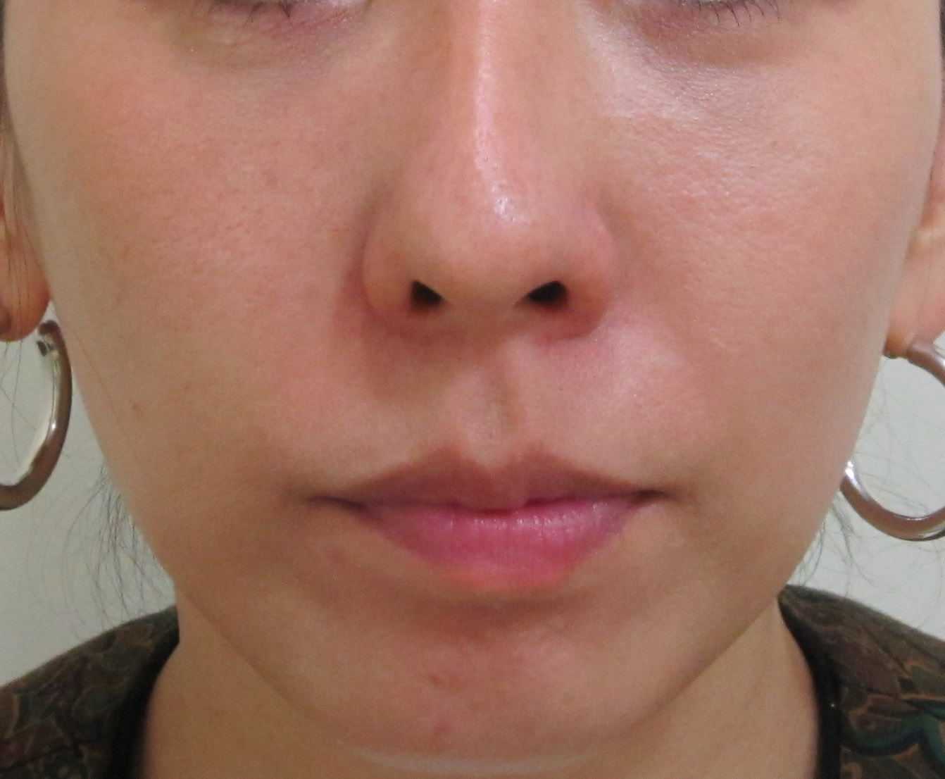 頬の脂肪の厚みにより、法令線の左右差(右<左)がみられます。