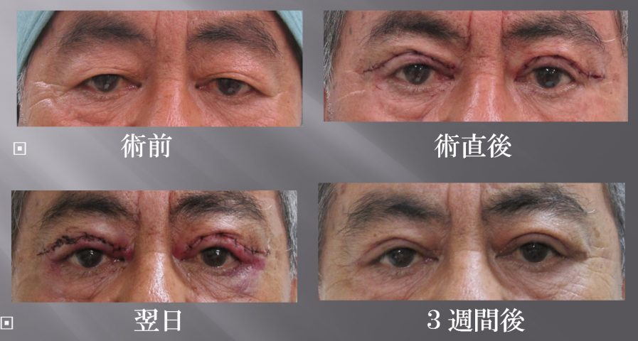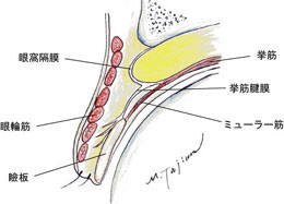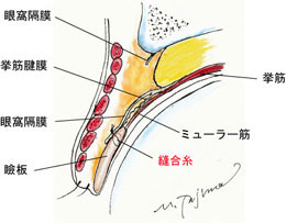 伸びて弱まった挙筋腱膜の代わりに挙筋腱膜とつながっている「眼窩隔膜」を使って瞼板と糸で縫合する手術です。