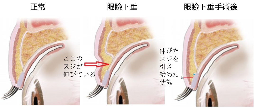詳細としては、伸びて弱まった挙筋腱膜の代わりに挙筋腱膜とつながっている「眼窩隔膜」を使って瞼板(まつ毛の根本にある硬い板のような組織)と糸で縫合します。