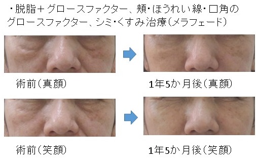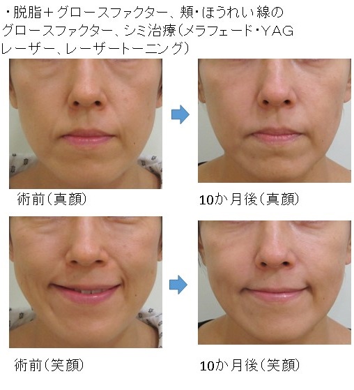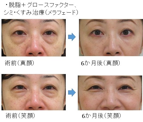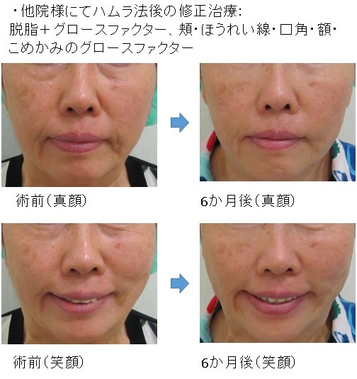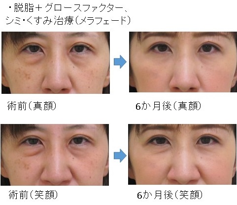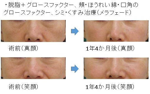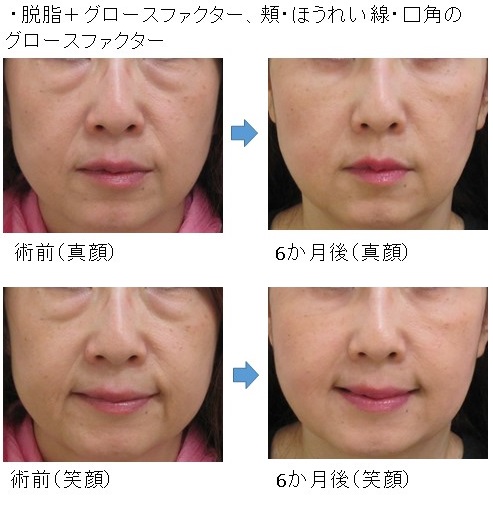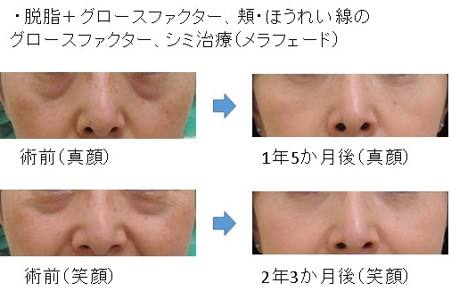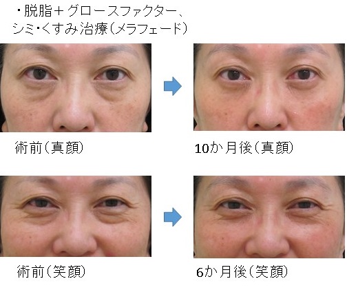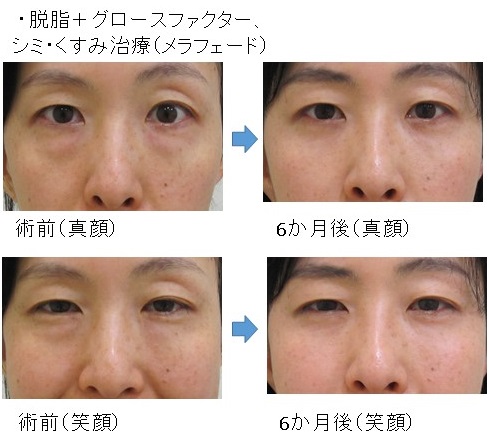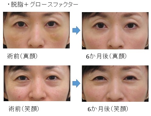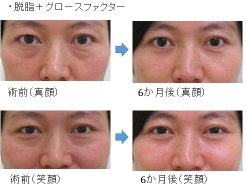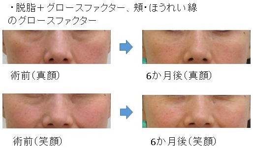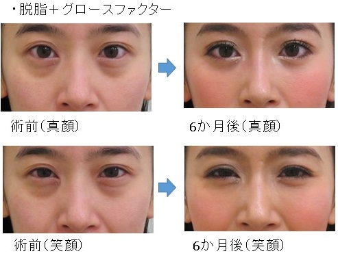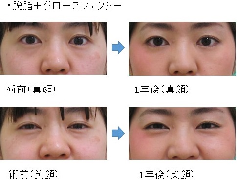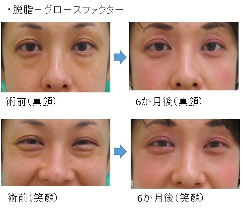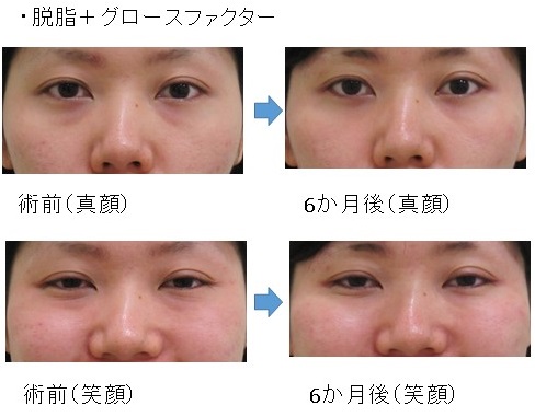 「脱脂+グロースファクター後」に「笑った時だけにできる目の下のふくらみ」が残った例
