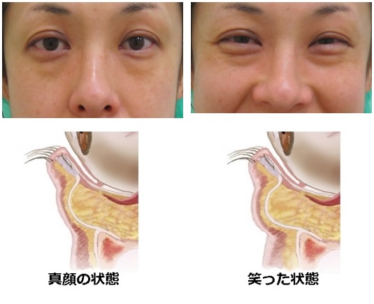 にっこりと笑った時に目の下がふくらむのは、目の下の脂肪が飛び出してくることが原因であることがほとんどです。