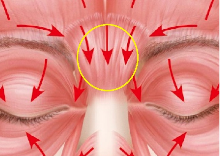 以下の黄色で囲った鼻根筋が鼻根部のシワの主な原因になります。