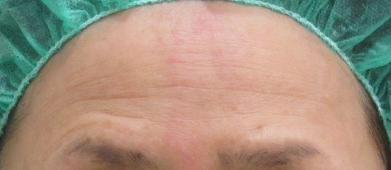 眉毛を挙げる癖により、シワが見られます。