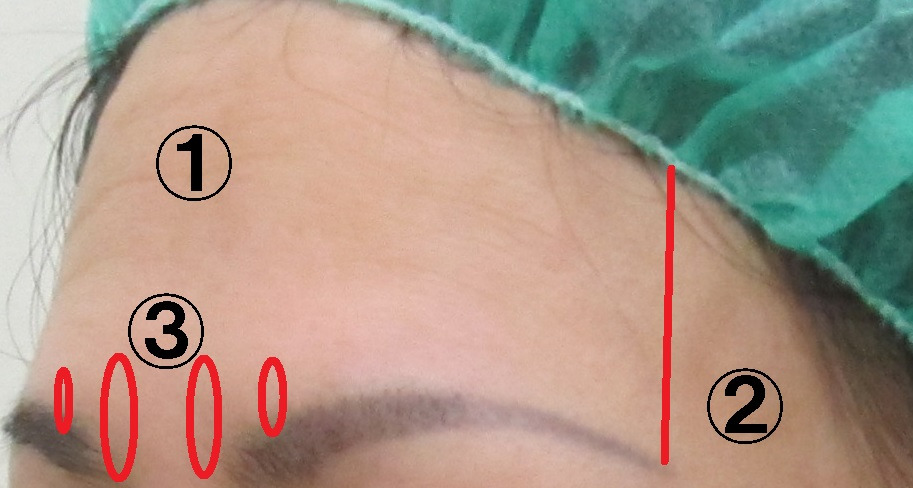 上図の①が額、②がコメカミです。(③の眉間は、シワに沿って打ちます。)