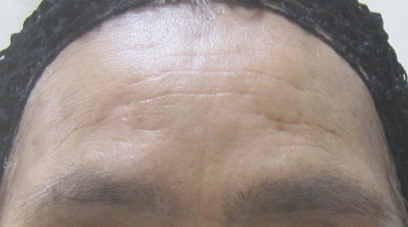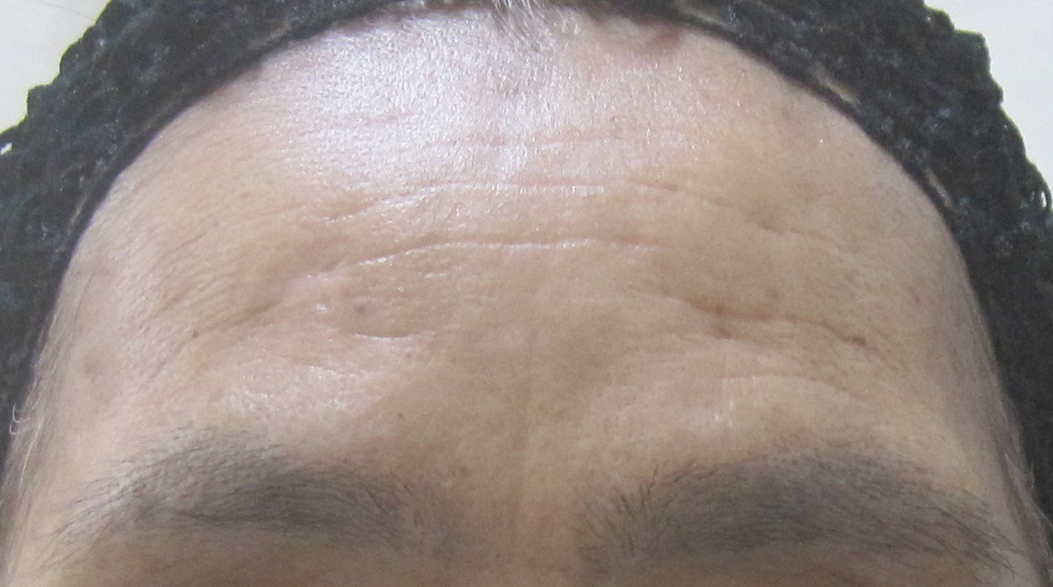 施術前・・・額のシワとこめかみのくぼみが見られます。