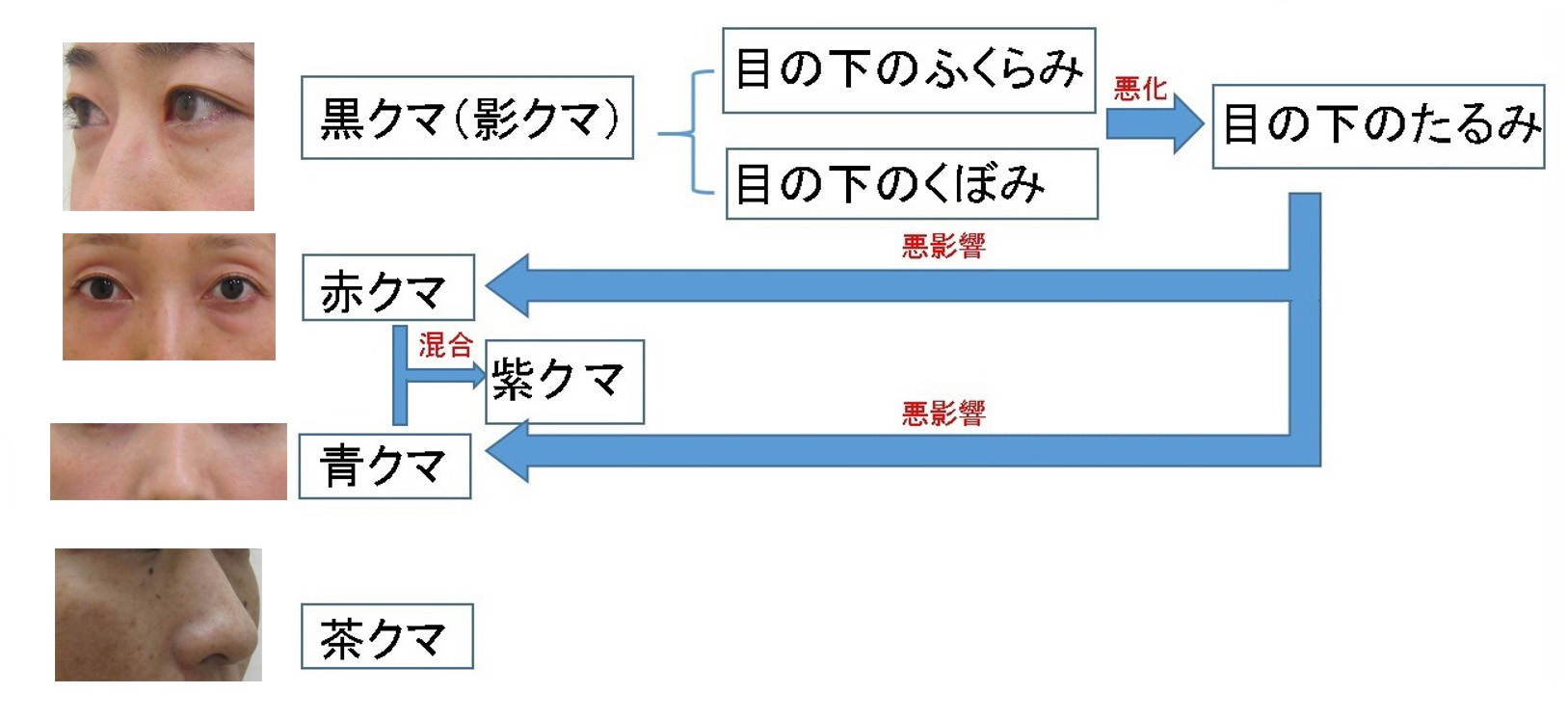 目の下のたるみ・クマの種類(黒・赤・青・茶クマ)と見分け方、黒クマの進行度についての解説です。