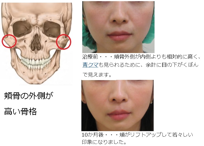 目の下のたるみクマ治療 頬骨外側が高い方の骨格に基づいた頬のリフトアップ