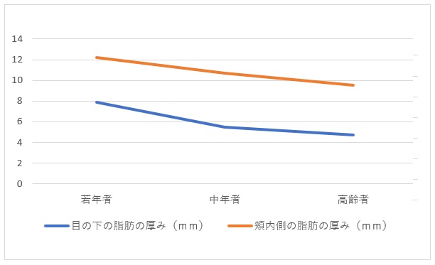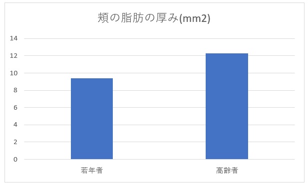 頬の脂肪の厚みは、高齢者の方が有意に大きかったという結果が出ています。(体重増加の結果を反映している可能性もあります。)