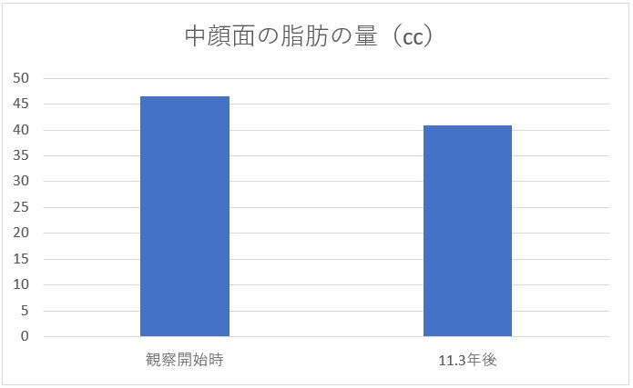 30~65歳の中顔面の脂肪の量を11.3年CTで観察した結果、顔の皮下脂肪は減ったという研究があります。