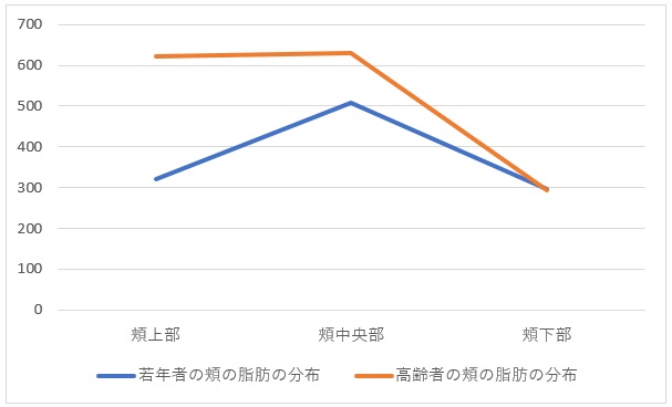 若年者では、頬の脂肪は、中央1/3にピークがあります。