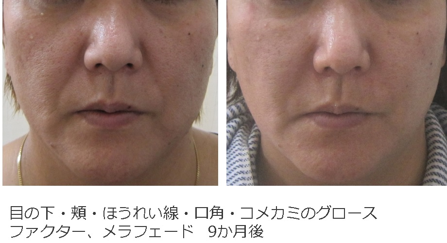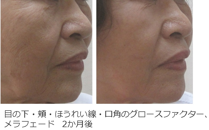 ①メラフェードによるシミ・くすみ治療、②グロースファクターによる顔全体のたるみ治療(目の下、頬、ほうれい線、口角)を受けられたモニターの方です。