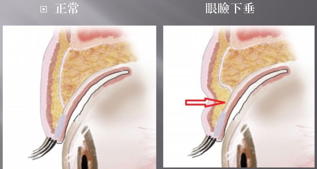 このスジの奥に筋肉があるのですが、スジが伸びているために、筋肉が頑張ってもまぶたが開きづらくなっています。