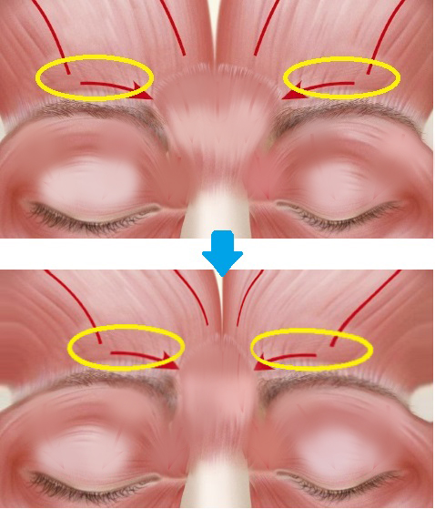 しかめっ面をすると収縮し、眉毛の内側は下に引っ張られます。