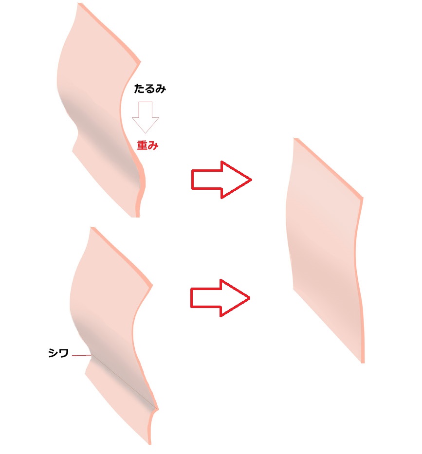 特に皮下脂肪が多い場合、皮膚と皮下脂肪はある程度くっついているため、一緒になって重力とともに落ちてきます。