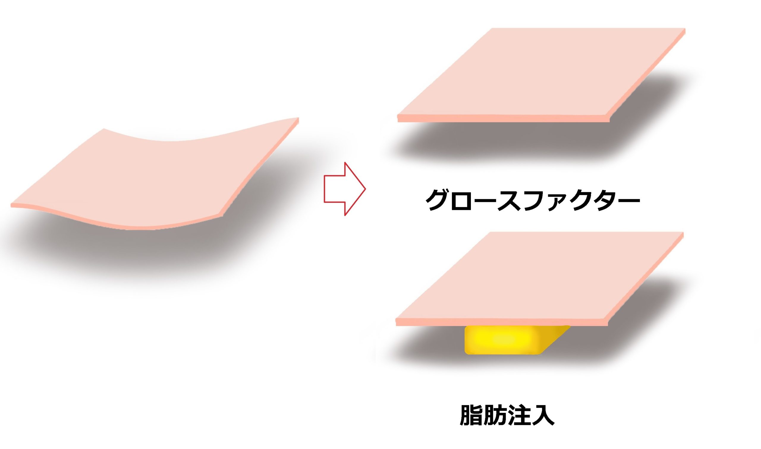 脂肪注入やヒアルロン酸は、皮膚そのものは変化せず、深部に詰め物をして、ふくらませるイメージです。