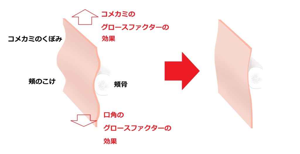 頬骨の突出+頬のこけがある方は、口角+こめかみにより、頬のこけの改善に対して相乗効果が期待できます。