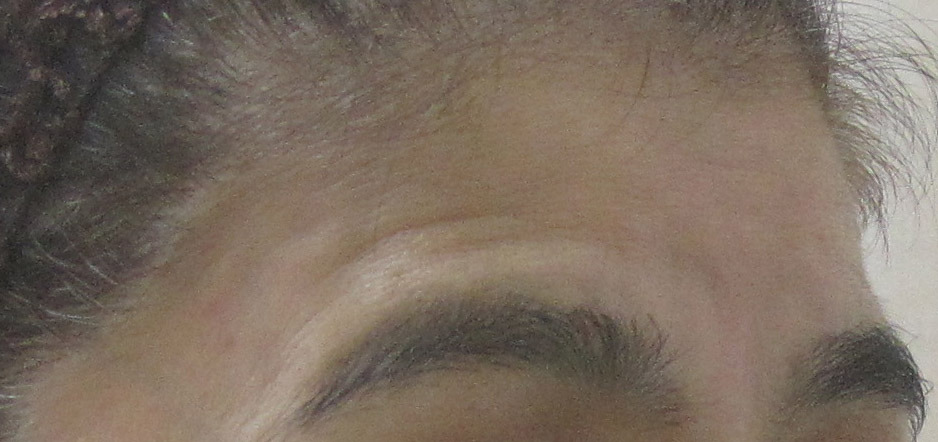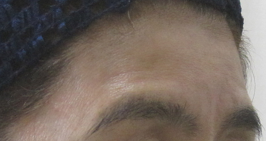 施術前・・・元々シワはありませんが、ごくわずかに骨ばった印象とこめかみのくぼみがあります。
