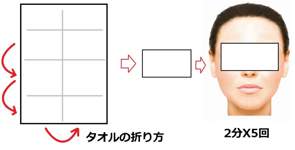後述のように、蒸しタオルの限界は2分程度のなので、温熱治療用アイマスクや蒸気温熱シートを利用するのが現実的と言えます。
