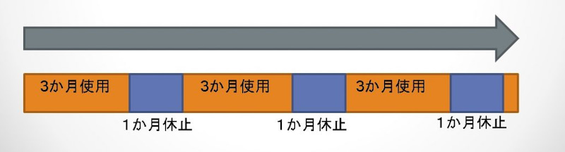 メラフェード終了後、2セット目以上継続される場合は、3か月ご使用後(メラフェードTがなくなった後)、1か月間休止するようにします。(最初にトライアルセットを使用される場合は、通算3か月ご使用後に1か月間休止)