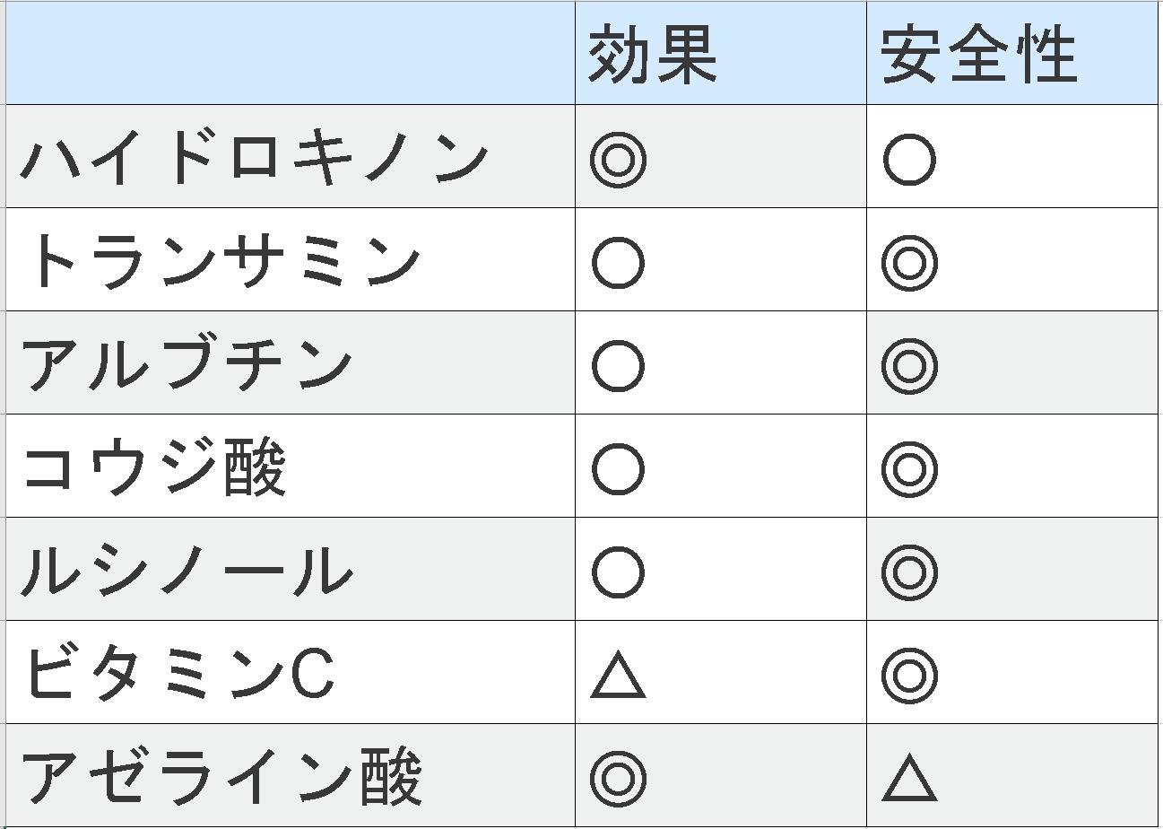 ハイドロキノンと他の美白剤との効果、安全性の比較を表にすると以下のようになります。